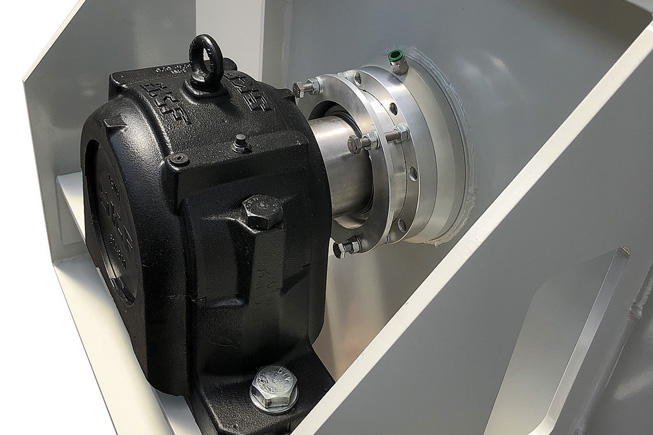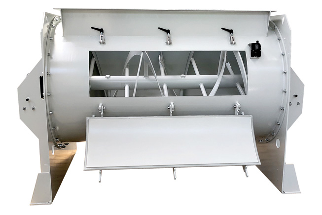 Since the blender needed to be fitted into an existing plant with other similar blenders, it was imperative that it should be made from a cylindrical drum (and not a typical U-trough). It had to be made ‘to measure’ (in order to fit into a limited existing space), required a large inlet hopper (along the entire mixer length), a large inspection door with ATEX-rated door lock. No opening/closing mechanism for the outlet (the material is removed by a screw conveyor). The OEM assembled the drive unit himself (the unit was requested bare shaft)